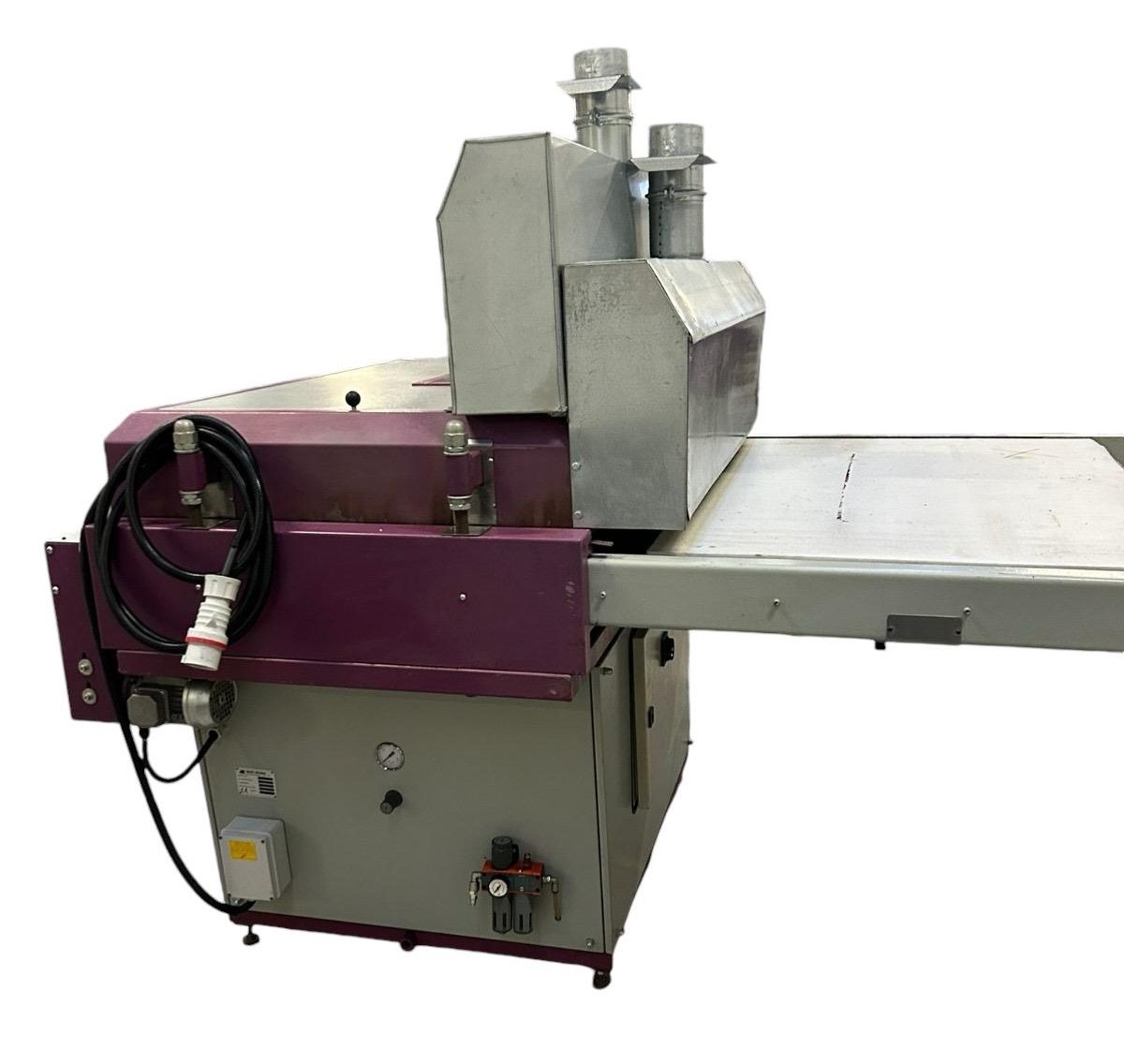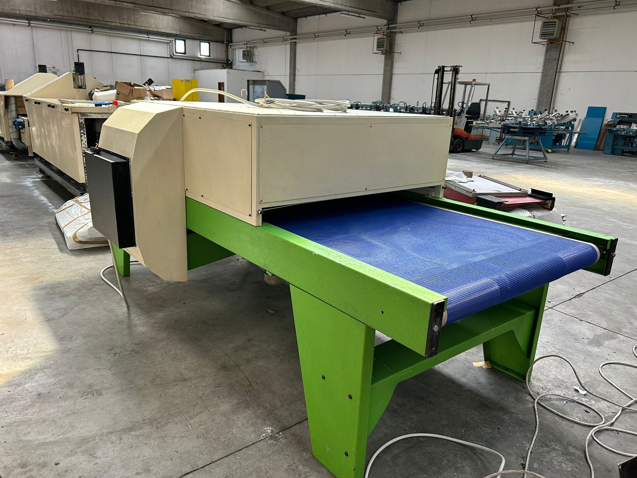 Alimentazione elettrica, completamente ad aria calda – temperatura massima 200° – ottimo per polimerizzare sia inchiostri plastici che all’acqua. Dimensioni 8m – utile tappeto 1m. Il forno è ricondizionato e portato alle normative di sicurezza attuali (2024). Venduto con garanzia e installato dai nostri tecnici.